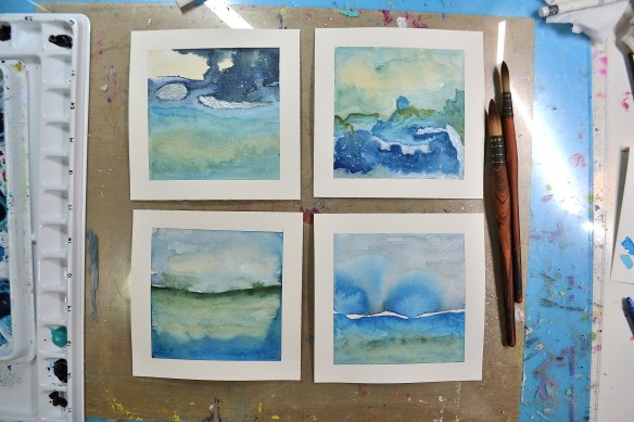 After choosing my favorite swatches, I moved into four 6×6 inch watercolor abstracts, carrying those discoveries forward. Even at this stage, the process stayed experimental. I adjusted water ratios, layered washes, and allowed organic edges to form naturally.