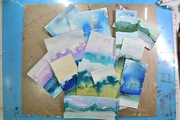 I started by creating lots of small watercolor swatches to test new color combinations, brushes, and techniques. These mini studies are where discovery happens. Each swatch becomes a low-pressure space to explore how pigments blend, separate, and create unexpected textures.