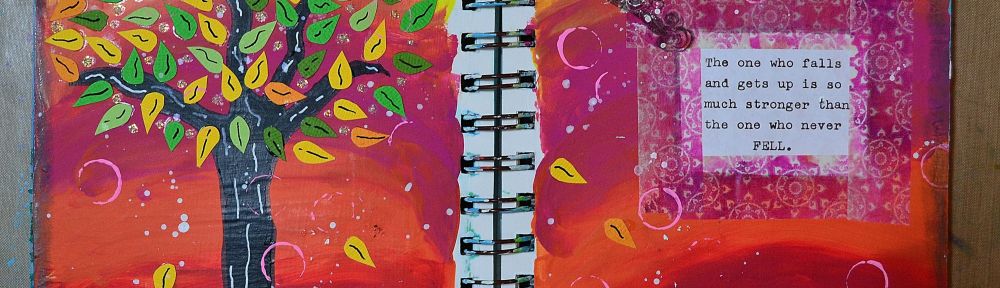 I created this spread in my 5.5″ x 8″ Strathmore Mixed Media Journal. I started by coating the pages with white gesso and letting it dry. Next I used Yellow, Fuschia, Orange and Red acrylic paints for the background. Once that was dry, I used black acrylic paint for the tree. Using a white Posca Pen, I added a little detailing to the tree. I went into my paper stash and found pretty shades of green, yellow and orange that I cut into very small leaves and glued them to the pages. I added a little detailing to the leaves with a Sakura Micron Pen 03.