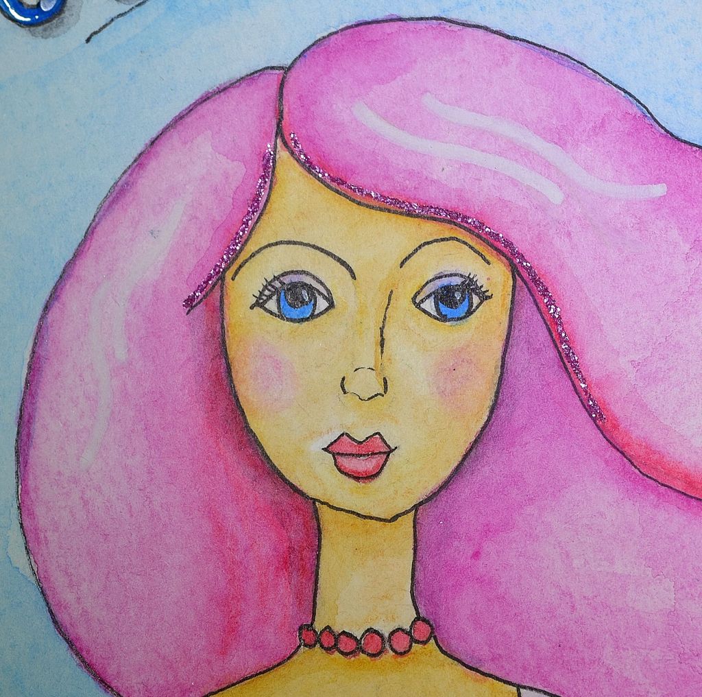 After the paint had dried, I outlined the sketch with Sakura Micron 005 Pen. Next I added a few highlights to her hair with a white Posca Pen and shading with a gray Stabilo Pencil. I also added a little bling to her hair with pink Stickles. Last I filled in the word Dream with Inkssentials Glossy Accents to give it a little texture.