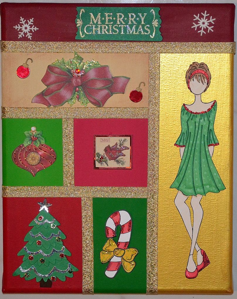 When I think of red and green, my mind goes straight to Christmas and the holiday season. I made an 8×10 canvas with acrylic paints, added stamped images and Christmas cut outs and accented it with gold ribbon.
