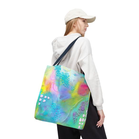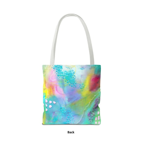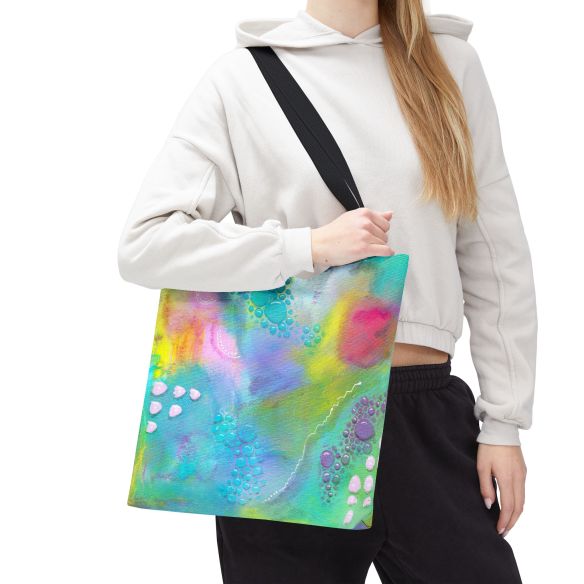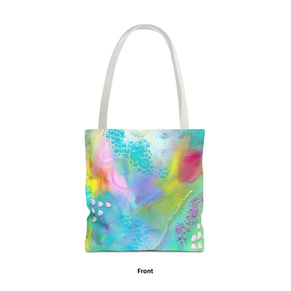 Inspired by expressive brushstrokes and uplifting color, the When Color Smiles tote features vibrant aqua, lemon yellow, lavender, and soft pink flowing together in a playful abstract design. The movement of color gives the bag a light, happy energy that instantly brightens everyday moments.