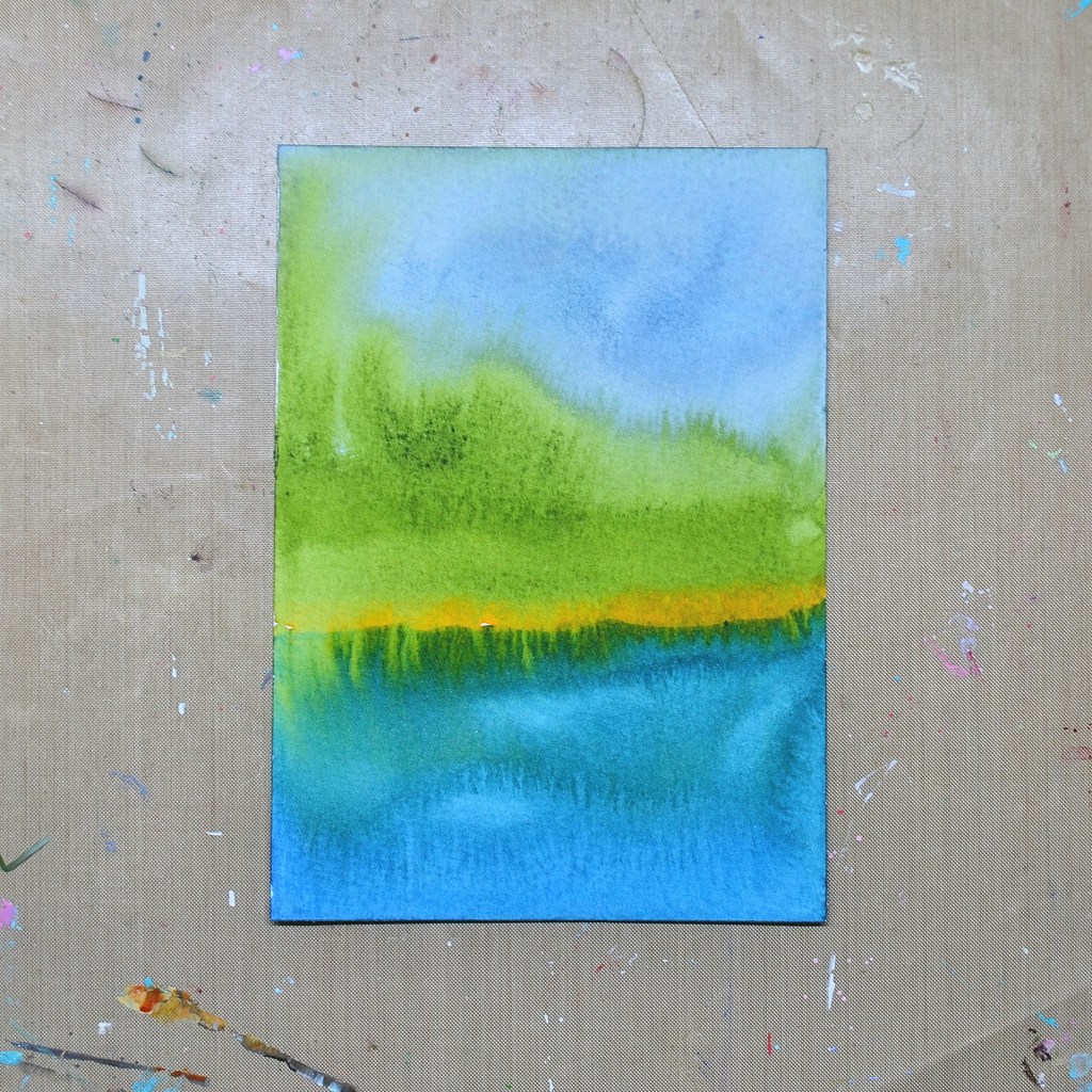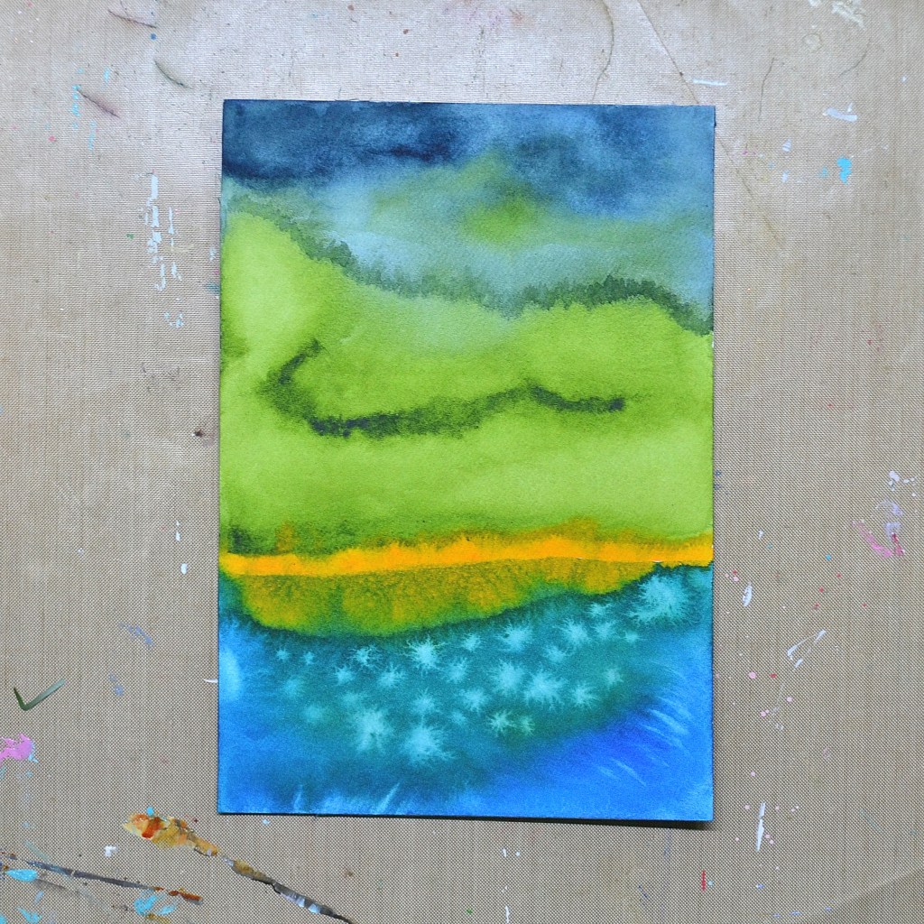 These two abstract watercolors began with flowing blues and vibrant greens, letting the pigments move and blend naturally across the paper. I added a glowing band of golden yellow, slightly off center, letting it find its own place within the composition.