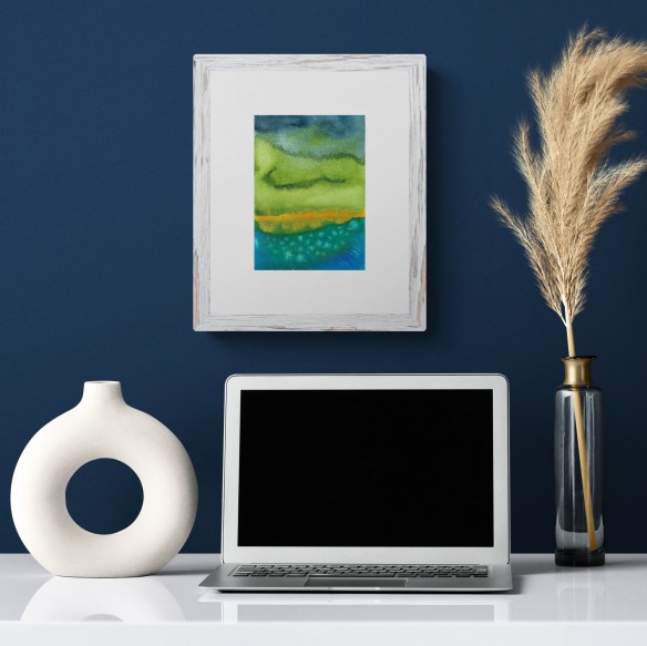 Golden Stillness invites a moment of pause, with deep, grounding blues and dreamy greens drifting above. Quiet Horizons has a brighter, more playful energy, with lively greens in motion and a golden glow that feels like sunlight dancing on water.