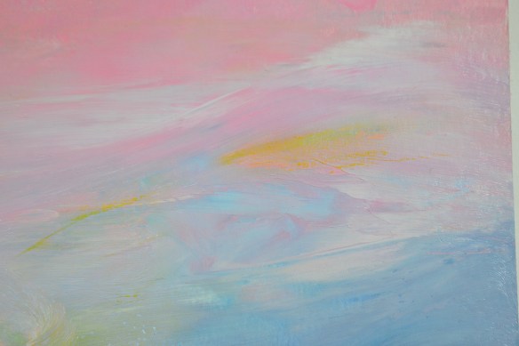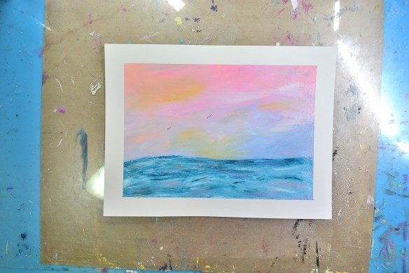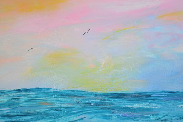 The sky became this soft, glowing wash of color—almost like cotton candy drifting across the horizon—while the ocean below grounded the piece with movement and depth. And those tiny birds? They seemed to appear right when they were needed, adding just a hint of life and story.