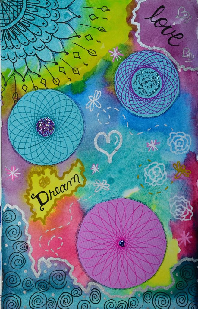 I made the little turtles using the same stamp as in the tag, colored them, cut them out and glued them into the journal. I wanted a little texture for the turtle shells so I used Inkssentials Glossy Accents.