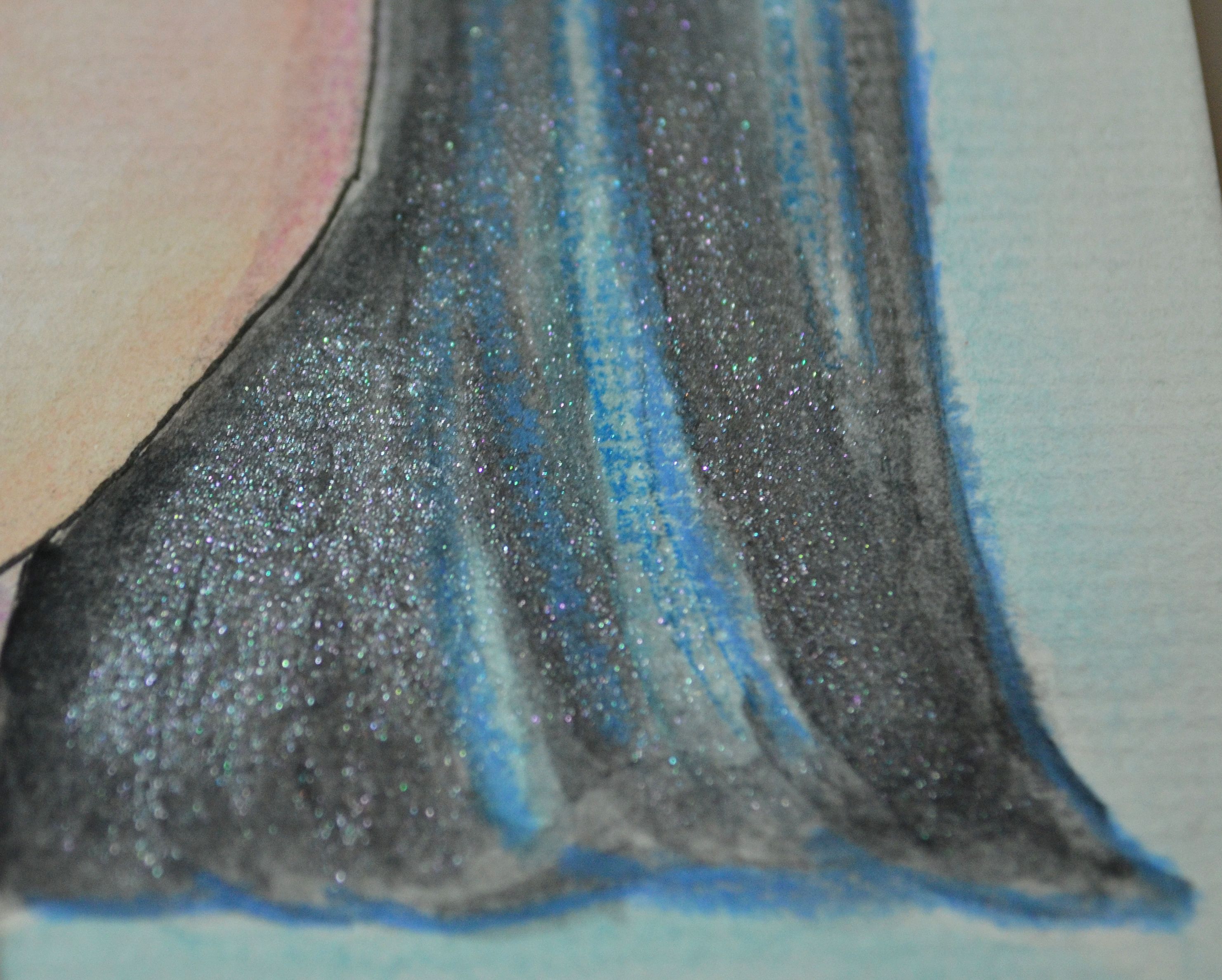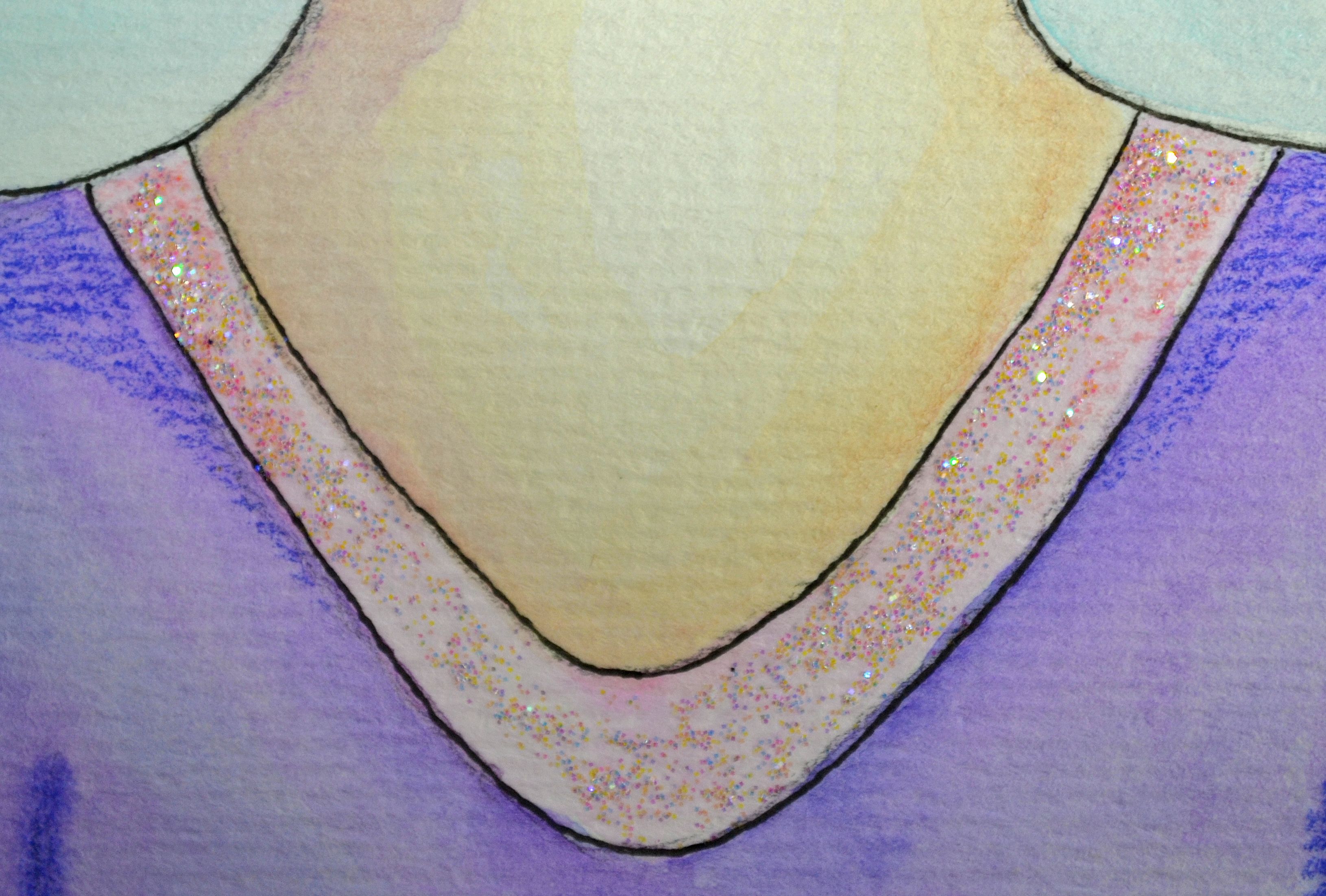Using a Sakura Micron 005 pen, outline her eyes, nose, earrings and necklace. With a Gel pen, outline the rose crown in her hair. Add a few highlights with a Posca pen and a little more detailing and shading with colored pencils. Last, add stickles to her hair, earrings and sleeves for a little bling.