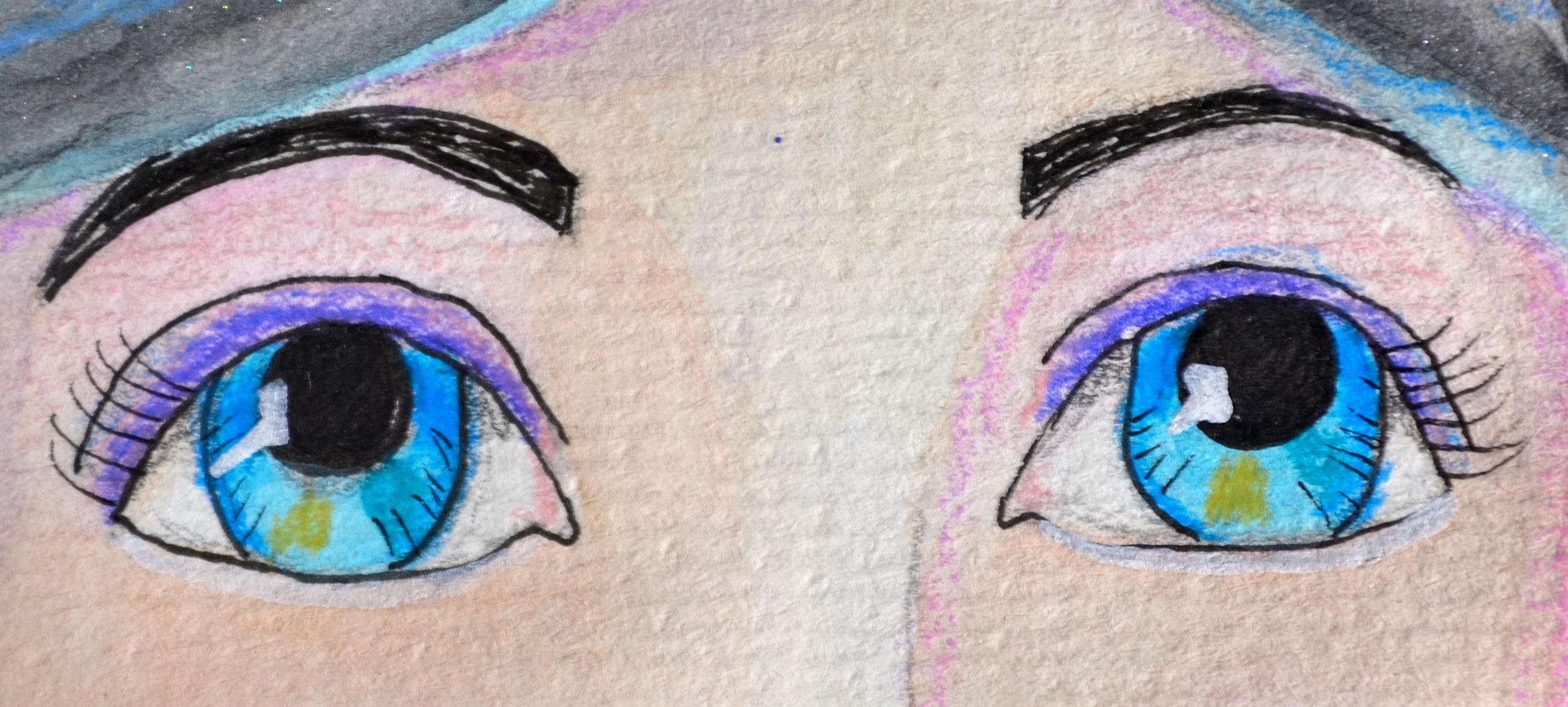 To make this painting, start with a light pencil sketch. Once you’re happy with your girl, you can start painting her with the watercolors. Always remember that when using watercolors, begin with a light wash and go darker by adding more layers. After the paint has dried, use colored pencils that are slightly darker than your paint colors to outline your girl.