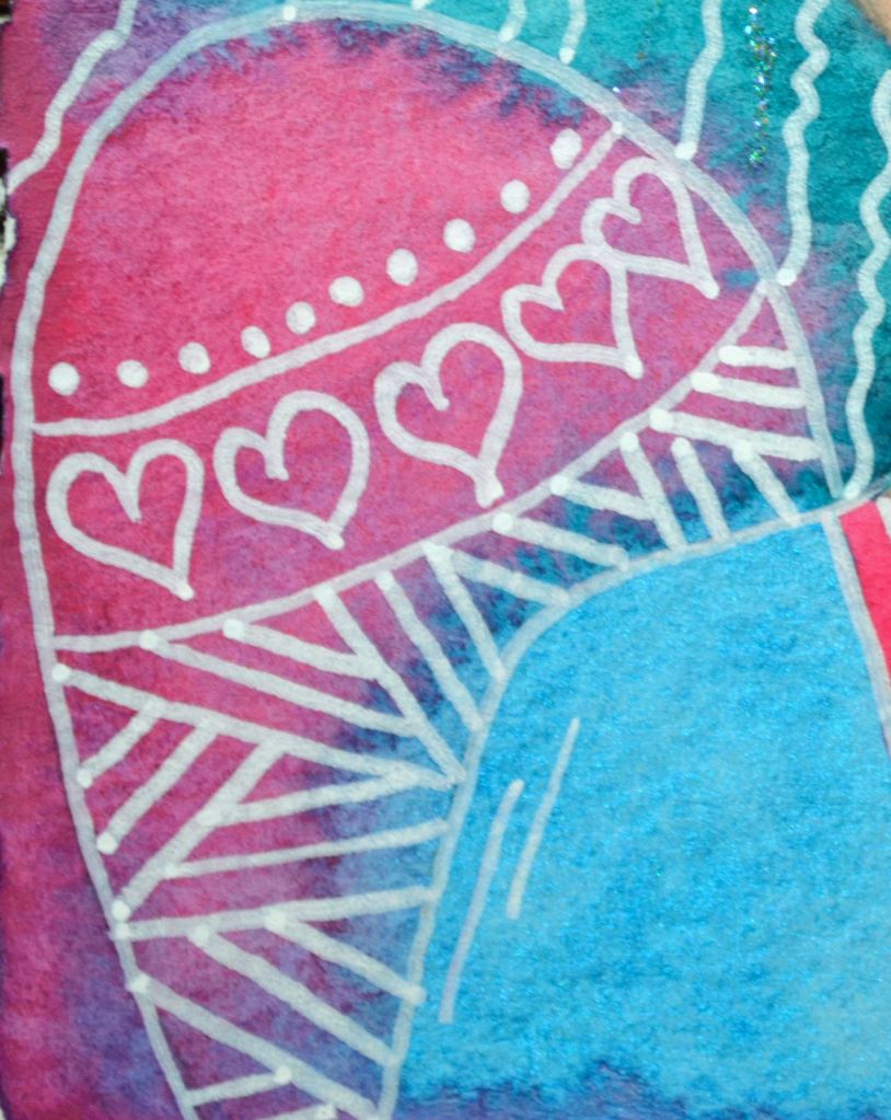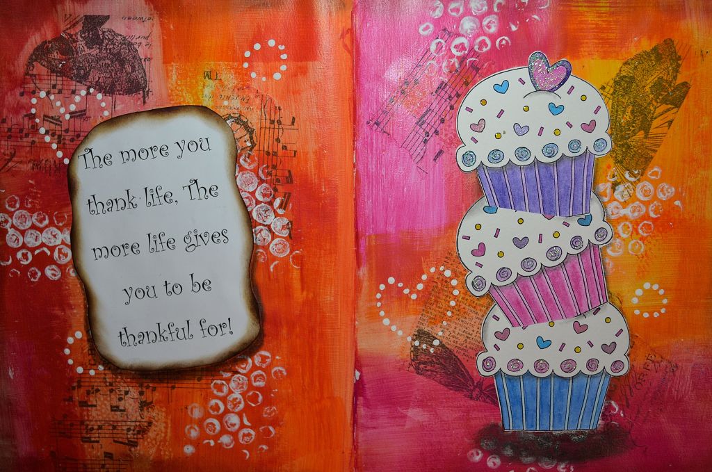 It’s fun to see where your art ends up because when I made this I started with my cupcake stamp and it grew into a stack. There wasn’t a lot of planning involved but rather going with the flow. So when you’re journaling and leery of the blank page, just start even if you only add a few scribbles. The important thing is to start and let your creative muse take over and have fun!!