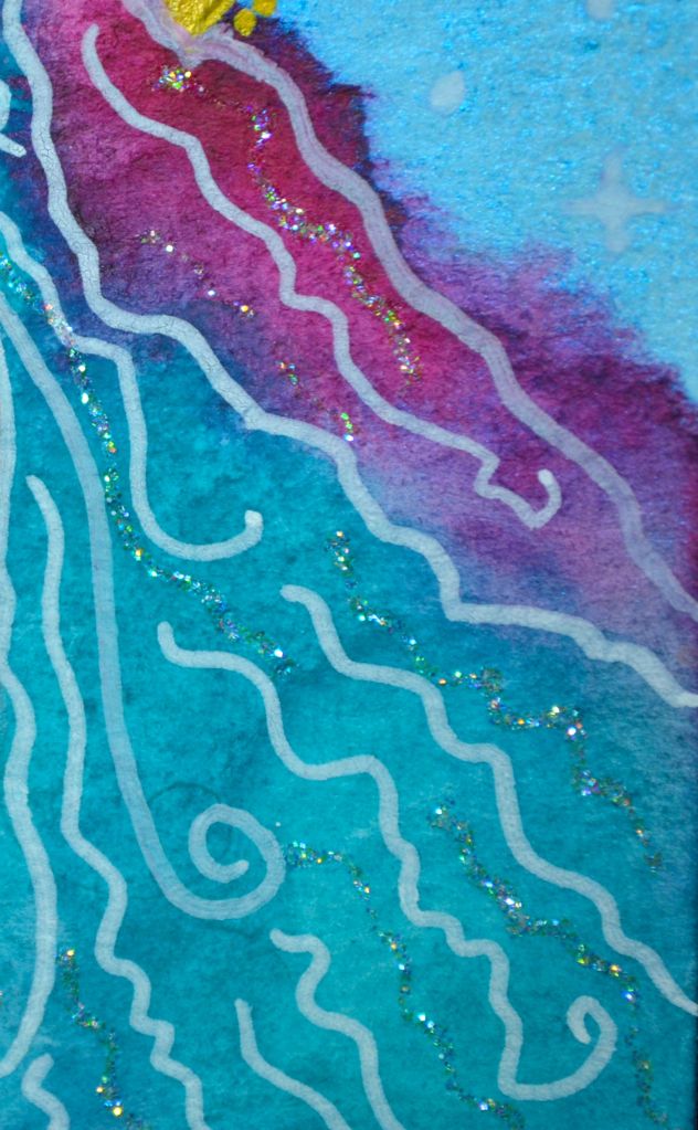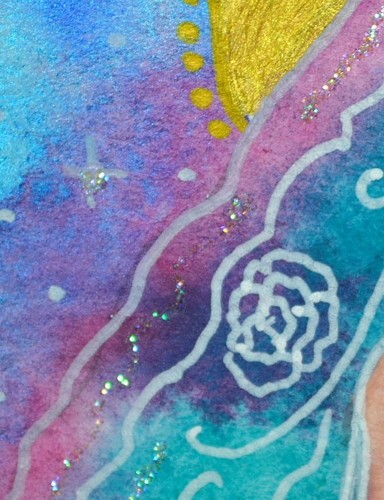 My latest angel from my Strathmore 5.5″ x 8.5″ watercolor journal. Her name is Rosie. I tried limiting the colors in this one. I really like the iridescent blue that I used around the stars, in her hair and clothes. It has a beautiful shimmer. But looking at her, she reminds me of an Easter or Spring Angel.