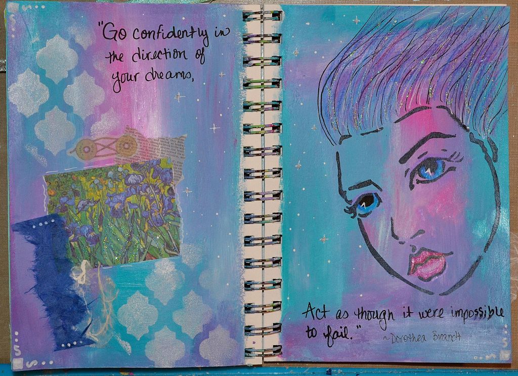 I had some leftover paint from one of my paintings and didn’t want to waste it so I used it in my Strathmore 5.5″ x 8″ Mixed Media Journal. I tried a new face stencil by Jane Davenport and loved it! I added a quote by Dorothea Brandt that reads “Go confidently in the direction of your dreams, Act as though it were impossible to fail.”
