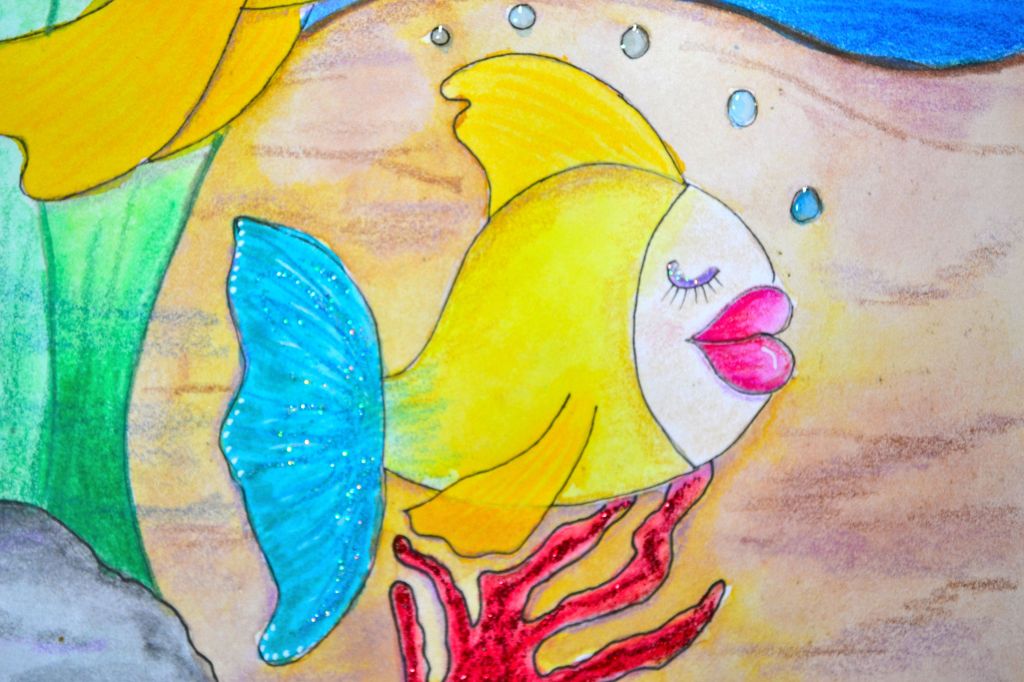 I gave myself a challenge to create a journal page in 90 minutes or less and this is what I ended up with. I started with a quick pencil sketch in my Strathmore 9″ x 12″ Visual Journal. Next I used watercolor pencils to paint the page and let it dry. I added detailing and shading with colored pencils, Sakura Micron Pen 005 and a white Posca Pen. For a little texture, I filled in the bubbles with Inkssentials Glossy Accents. And of course, lets not forget the bling with Stickles.