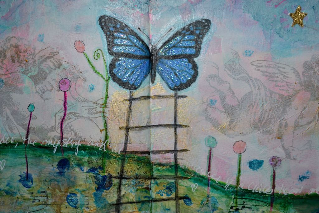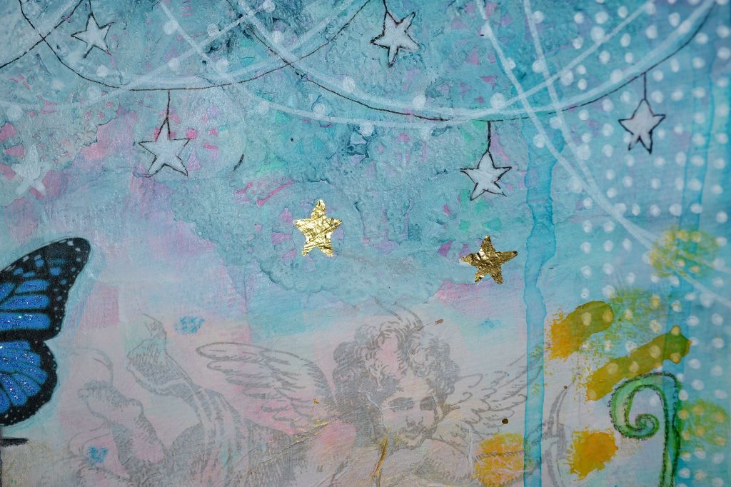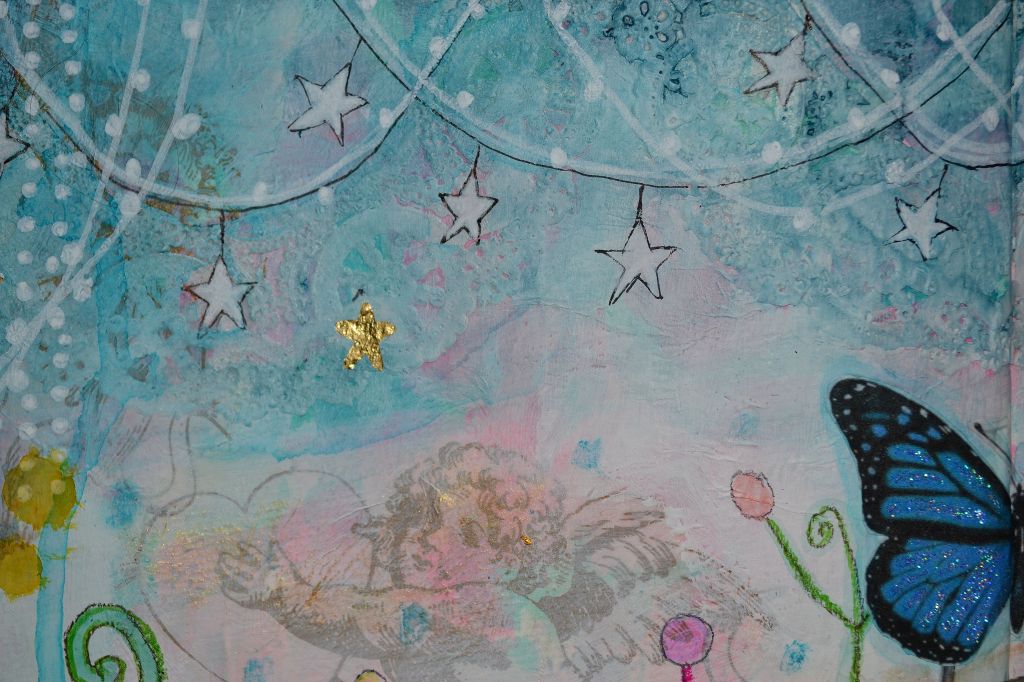 I’ve been working on creating a new design for the Expressions of Love Collection and this is what I came up with. It’s an organic design with beautiful hearts, outlined in glistening gold. I collaged a paper doily to the background for a bit of romance and it can be seen on each heart.