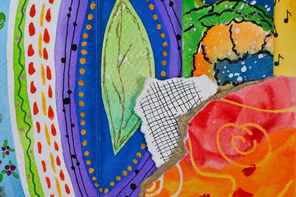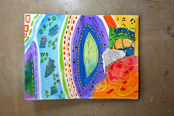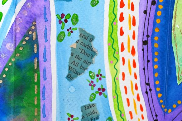 This piece was created in my Strathmore Watercolor Journal using only three shades of blue. I added some line work and fun details with Posca pens and gold metallic markers. It turned into an interesting little design that really invites you to stop and look a bit closer.