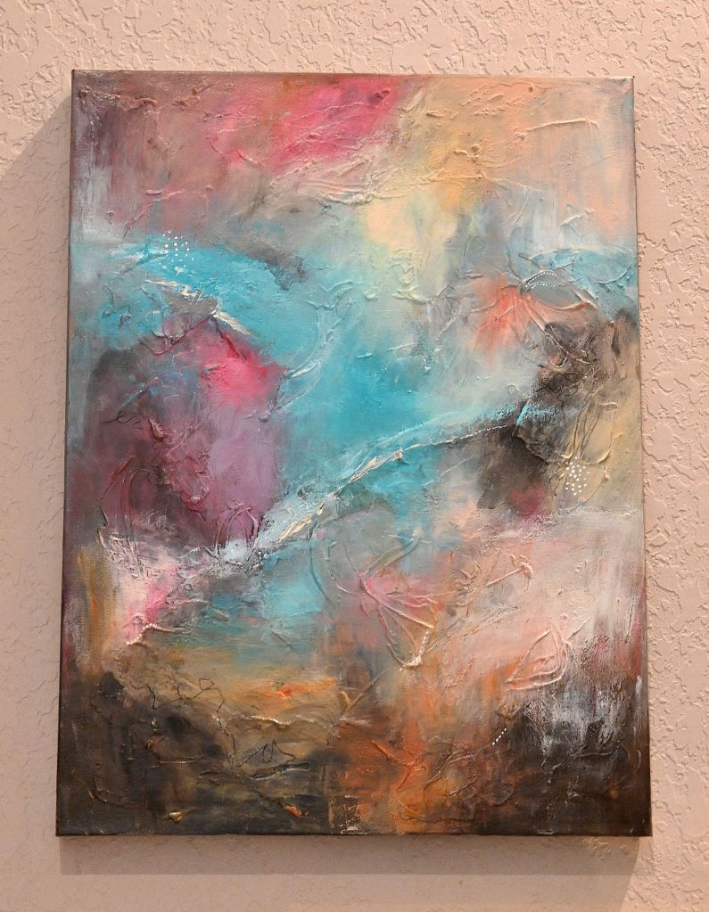 As I added final touches in the weeks that followed, I kept returning to that early light—the quiet, glowing energy that filtered through the window that morning. The colors in this piece—turquoise, rose, golden peach, and warm earth tones—carry a softness, a hush, almost like a breath between thoughts. There’s boldness in the movement, yes, but also a sense of calm rising through the layers.
