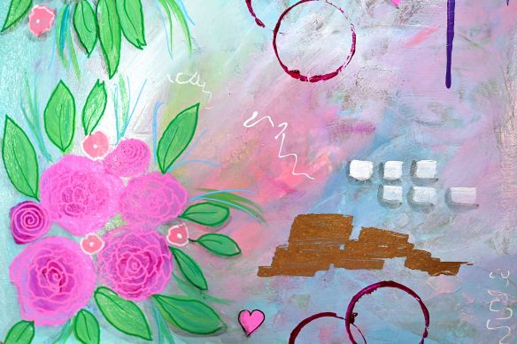 I began with a loose, abstract background and added some handwritten thoughts. Layers of acrylic inks came next, creating rich textures and pops of color. It felt fun and free, so I kept building—adding more layers with acrylic paint and pens to deepen the design.