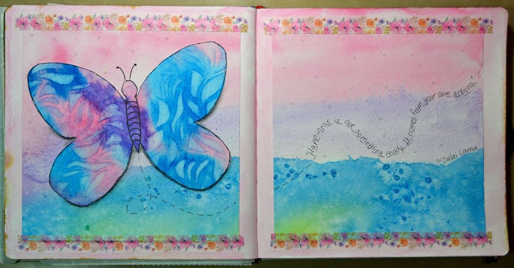 I did a watercolor wash with a watercolor butterfly painted separately and then cut out. I added a quote from the Dalai Lama” Happiness is not something ready made. It comes from your own actions.” ⠀ After putting everything together in the journal I made a last minute change and decided to write the quote directly on the page. This is why you shouldn’t create art when you’re tired because I finished this late at night and well, I left out the word “made” from the quote 😂😂😂 Oh well…