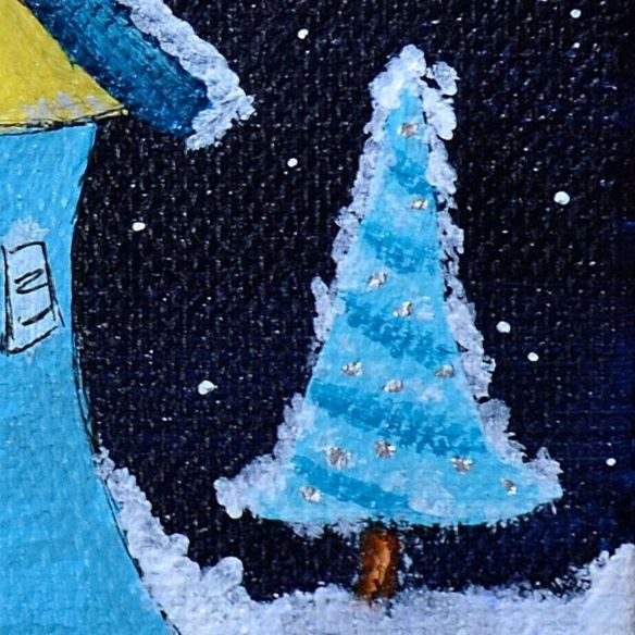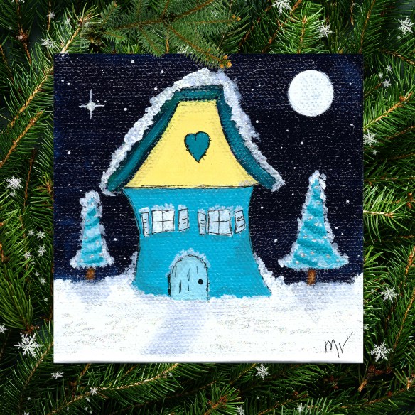 The second piece, All Is Calm, is a one-of-a-kind 4×4 inch canvas that captures the peaceful stillness of a winter’s night. A whimsical blue house is nestled between two bright Christmas trees, with the moon and shining North Star overhead. A sprinkle of glitter gives it that extra holiday sparkle, making it a perfect reminder of the calm and magic the season brings. Whether you display it on your tree or gift it to someone special, this little painting is sure to bring a smile.