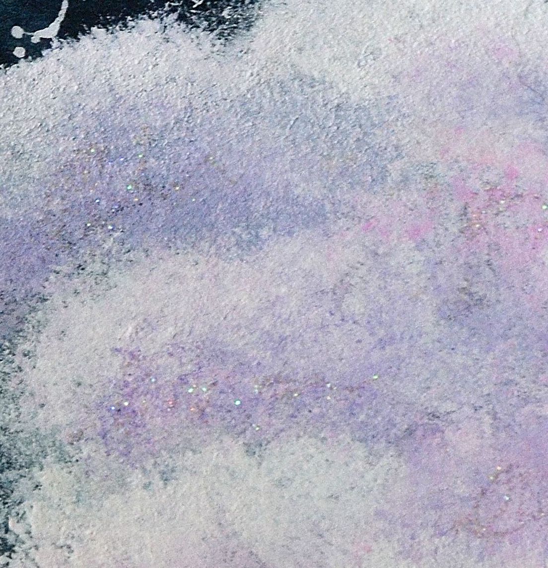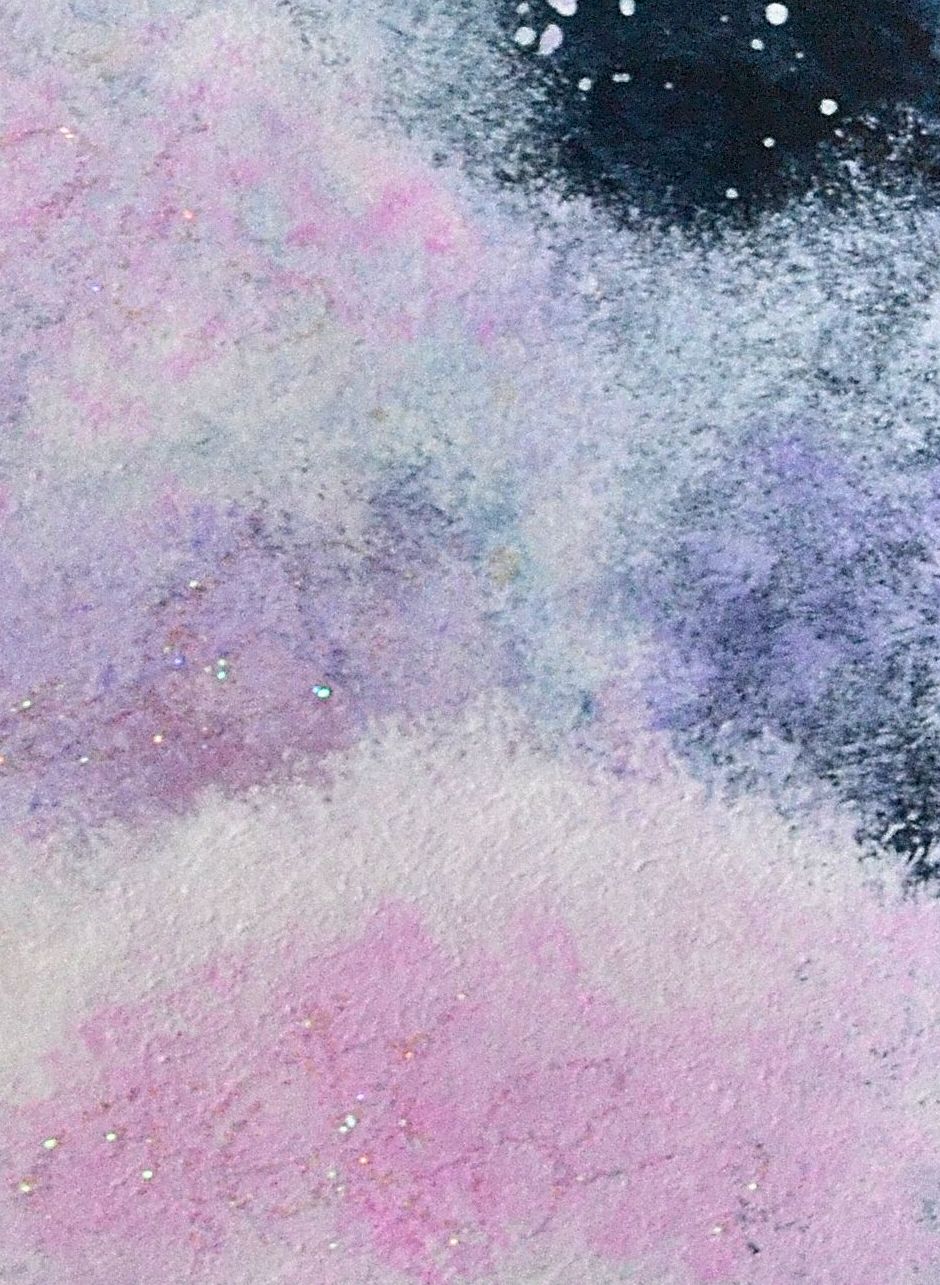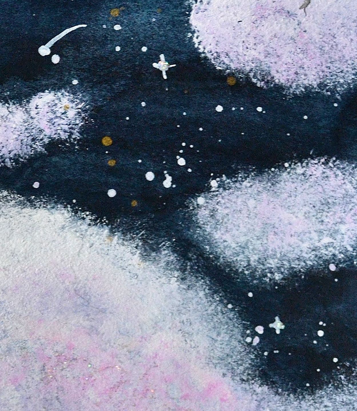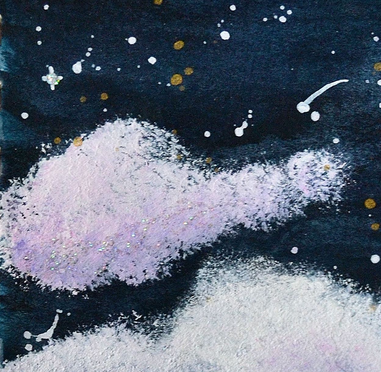 This was created on a watercolor block with acrylic paints. I added subtle touches of gold and a bit of glitter to the clouds for sparkly magic.