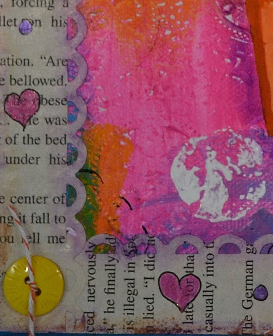 It was a pretty simply layout that I started with collaged pieces of printed tissue paper by Tim Holtz for the background. I lightly painted over them with pink and orange acrylic paint making sure you could still the collaged papers peeking through.