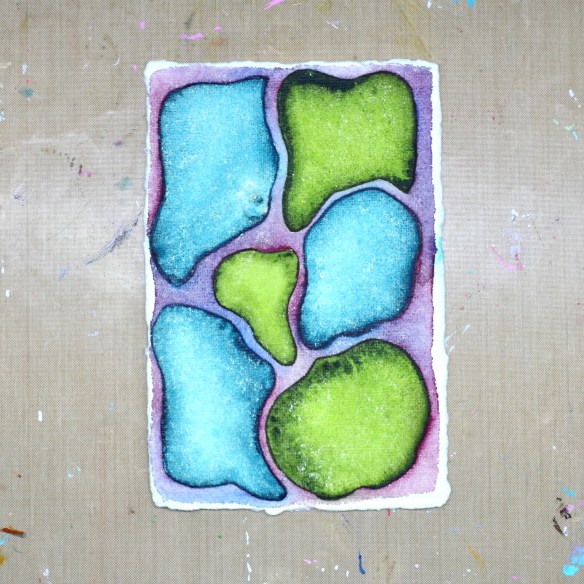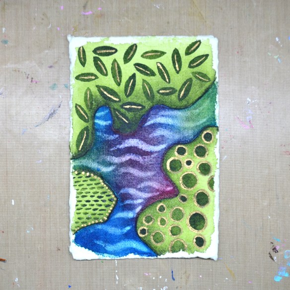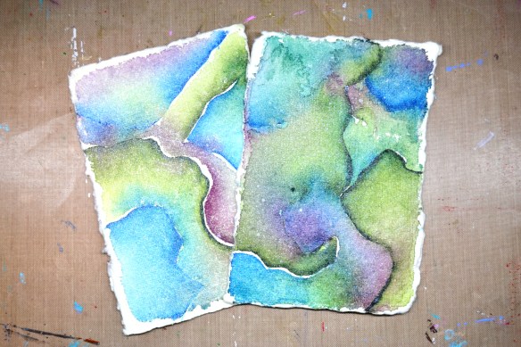 These pieces were created on 140 lb handmade watercolor paper—and I’ll be honest, it’s not my favorite. There are areas where the paint just refuses to soak in, no matter how much I layer it on. The paper also has a yellow-green tinge, which works beautifully with some color palettes… and not so much with others. Part of the process, right?