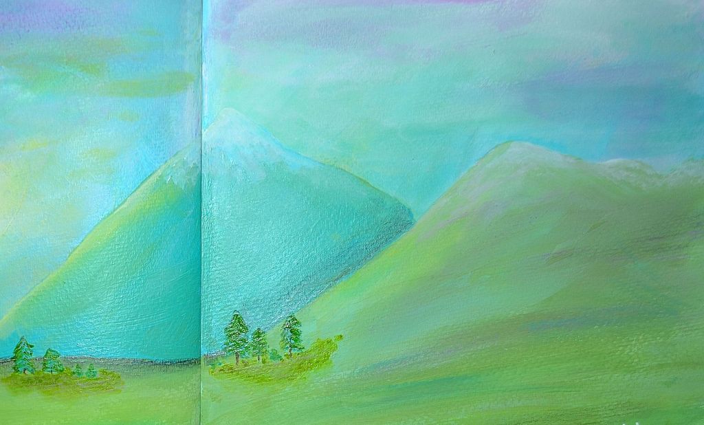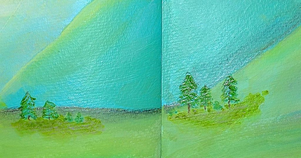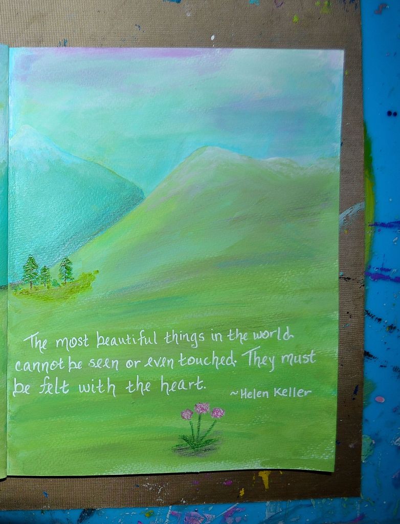 For this design, I saw mountains emerge and went with that. Some areas turned out too light so I used colored pencils to give it more depth and to define the mountain tops a little more. It was still needed a pop of color so I added I added pink flowers and of course finished it off with a little bling.