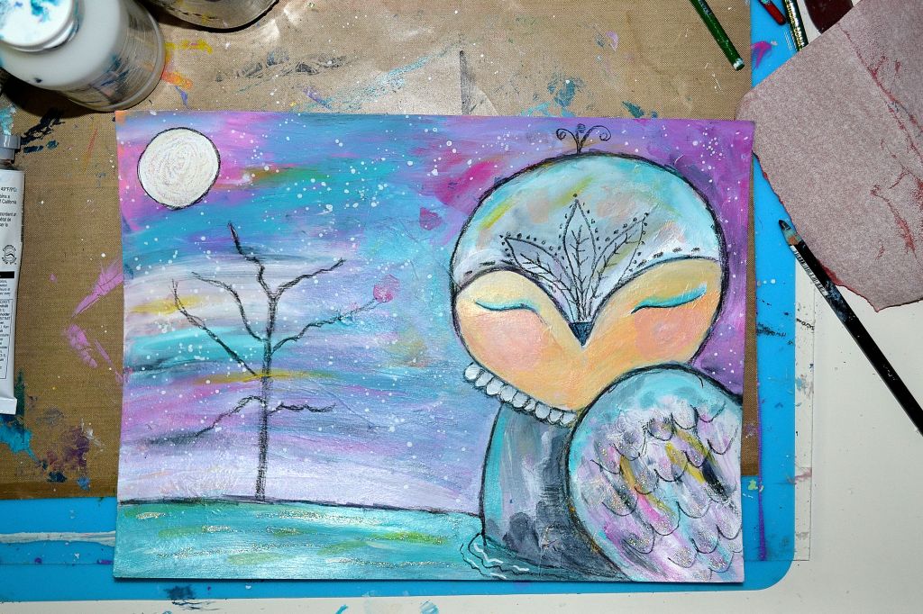Juliette is presently offering a free online workshop on her website JulietteCrane.com. So needless to say, I couldn’t resist! It’s a quick owl painting that takes about 30 minutes and is lots of fun. She peaked my interest with some new supplies that I will definitely be getting and exploring with.