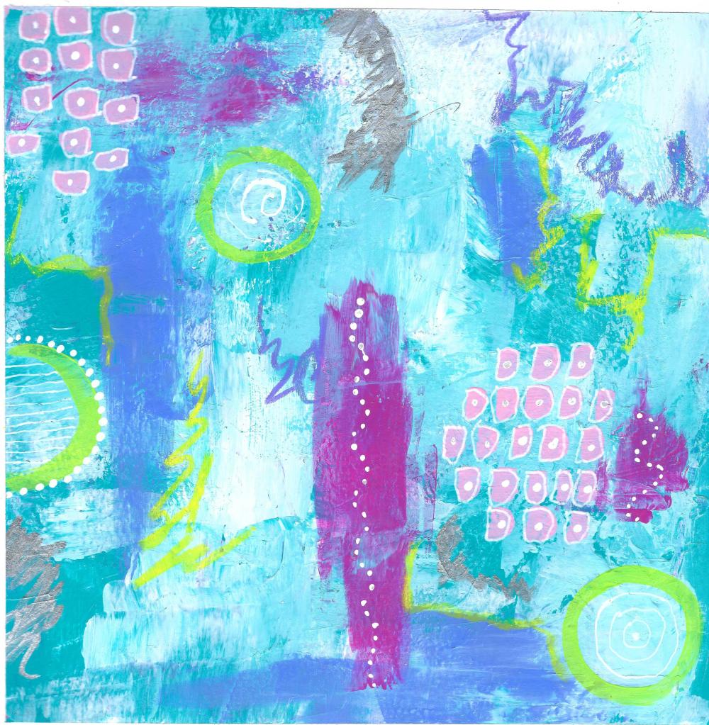 This playful abstract emerged from a session of pure experimentation. I challenged myself to use familiar tools in unfamiliar ways—flipping brushes, dragging paint with unexpected edges, and layering with silicone paint brushes. The result? A vibrant swirl of turquoise, chartreuse, and magenta, accented by whimsical dot patterns and textural scribbles.