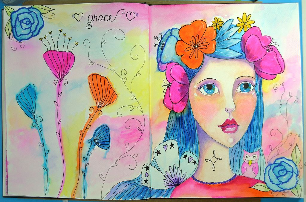 After everything was done, I thought she turned out pretty cool, even with her blotchy skin. I loved the color combination on this one, the green gave it that extra pop. I added the quote using a stencil which I just got on amazon. It’s part of a 20 pc set of inspirational quotes and was very reasonably priced. The stencils are perfect for journaling.