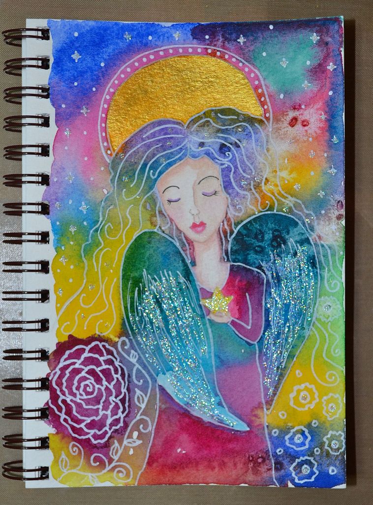 This is my latest angel that I created in my Strathmore 5.5″ x 8″ watercolor journal. I always start with a light pencil sketch first and then paint with bright fun colors. I’m currently working on a larger angel but she isn’t done yet, so stay tuned.
