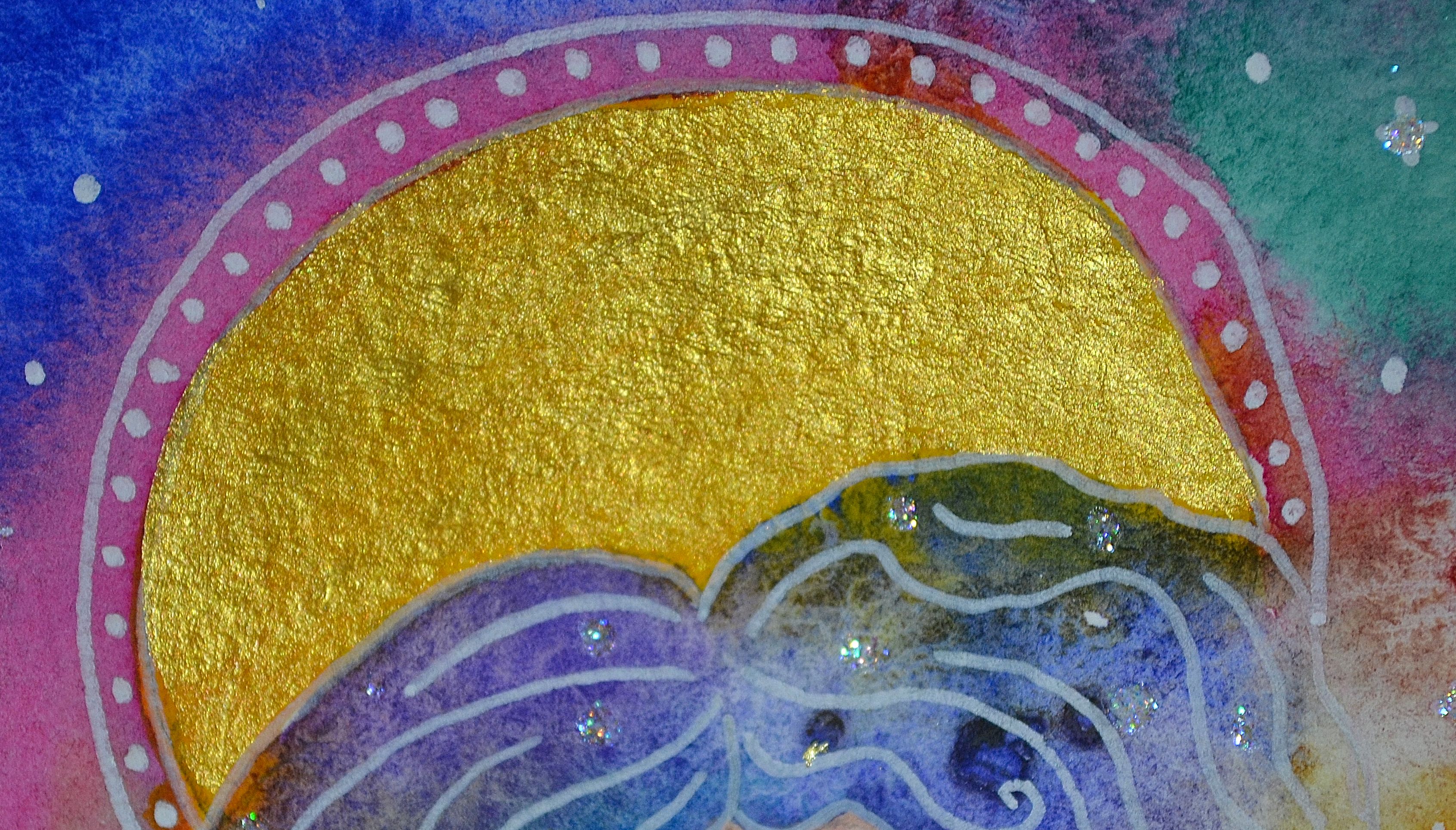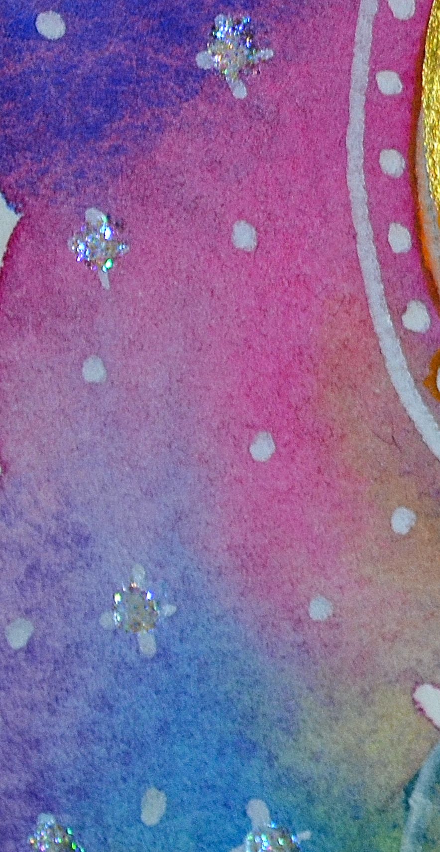 Once I get the colors to where I like them I let them completely dry. Next I painted her halo with gold acrylic paint and let that dry. I then added doodles with my white Posca pen and a little more detailing with watercolor paints and colored pencils. I finished her off with a little bling. I love the little sparkles of magic.