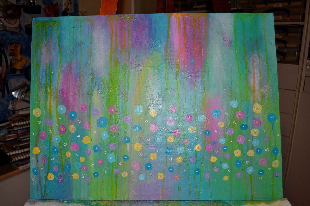 This is the finished 18×24″ flower abstract painting that I’ve been working on. It was painted with radiant colors to brighten the decor in any room. The background has lots of texture and I added splashes of white pearl paint for more interest.