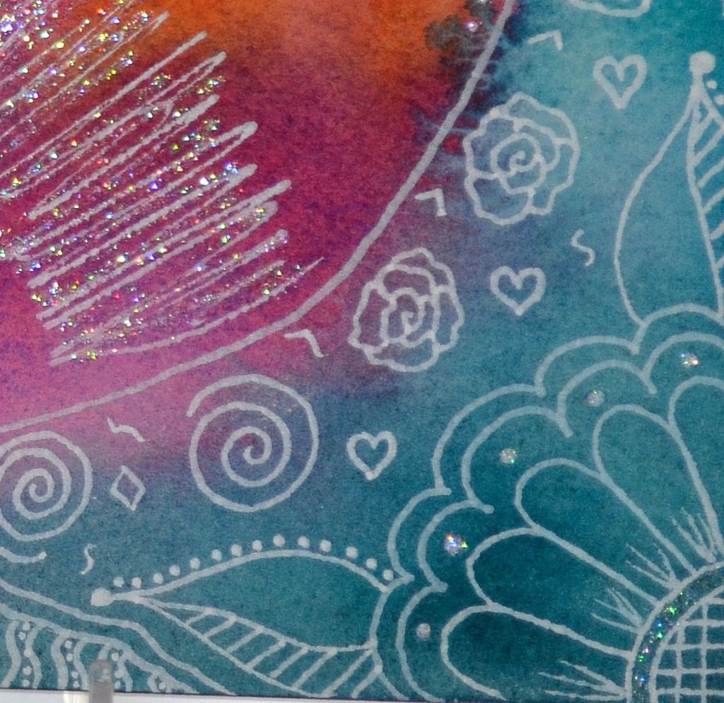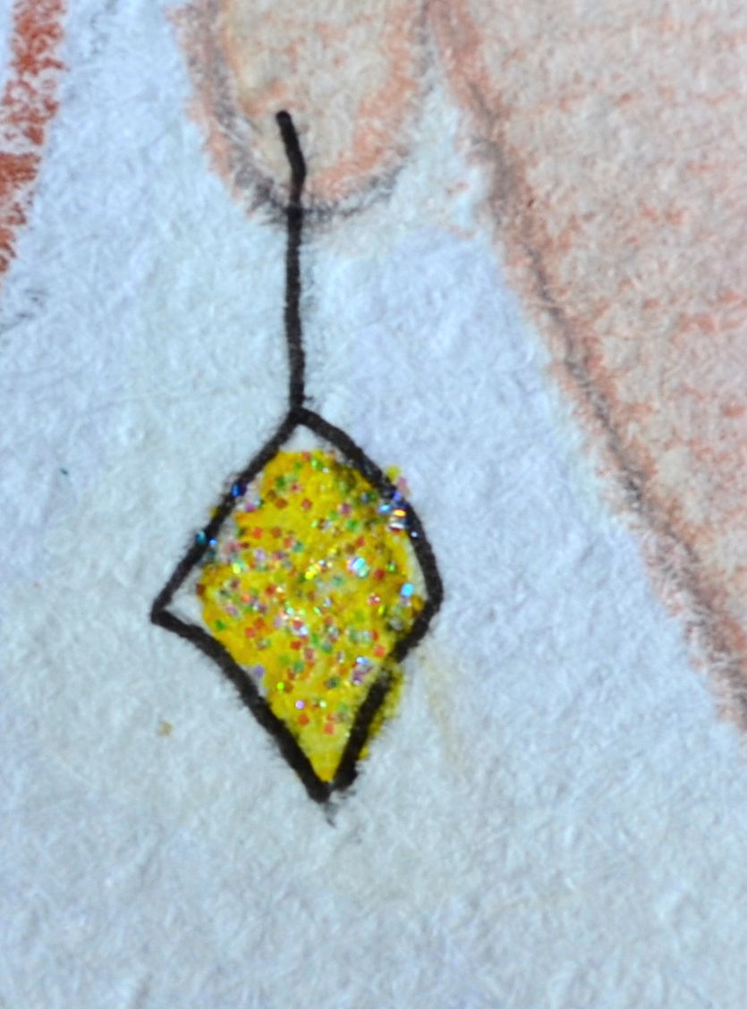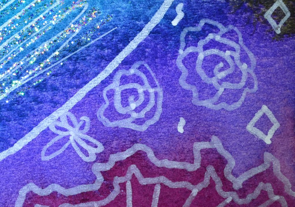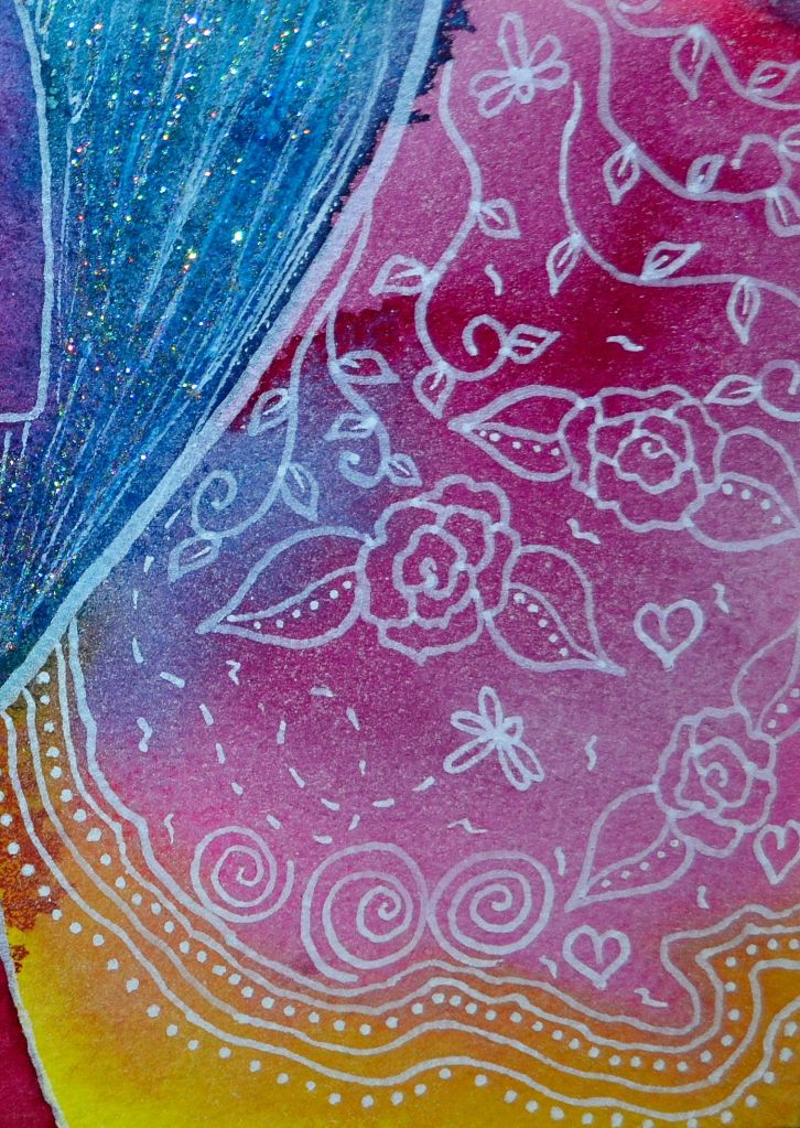 Using a Sakura Micron 005 pen, outline her eyes, nose, earrings and necklace. With a Gel pen, outline the rose crown in her hair. Add a few highlights with a Posca pen and a little more detailing and shading with colored pencils. Last, add stickles to her hair, earrings and sleeves for a little bling.