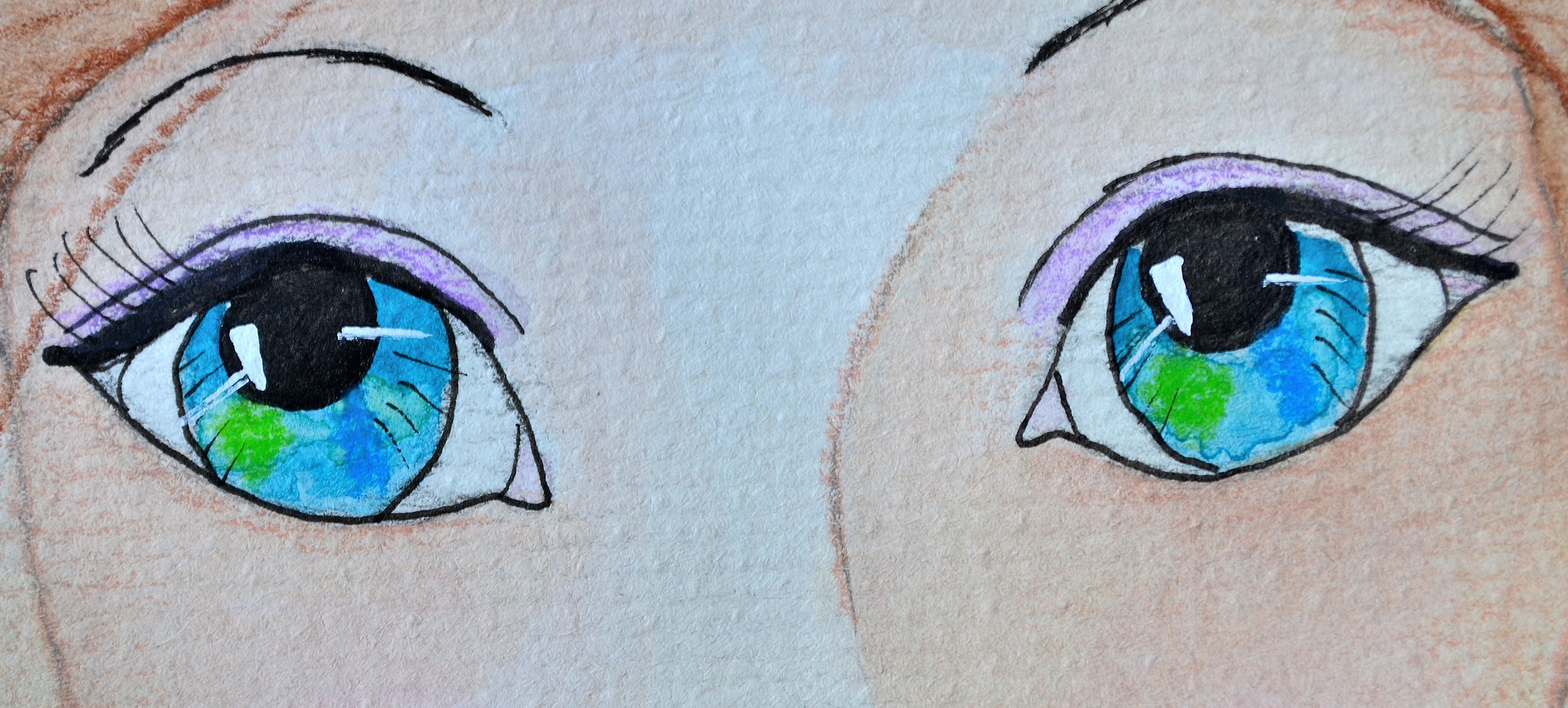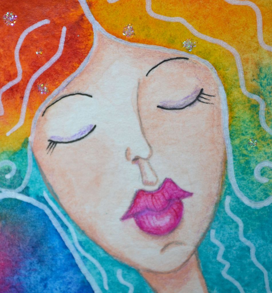 To make this painting, start with a light pencil sketch. Once you’re happy with your girl, you can start painting her with the watercolors. Always remember that when using watercolors, begin with a light wash and go darker by adding more layers. After the paint has dried, use colored pencils that are slightly darker than your paint colors to outline your girl.