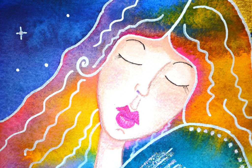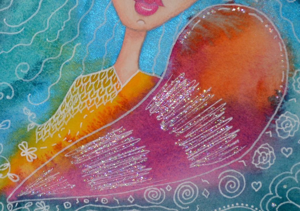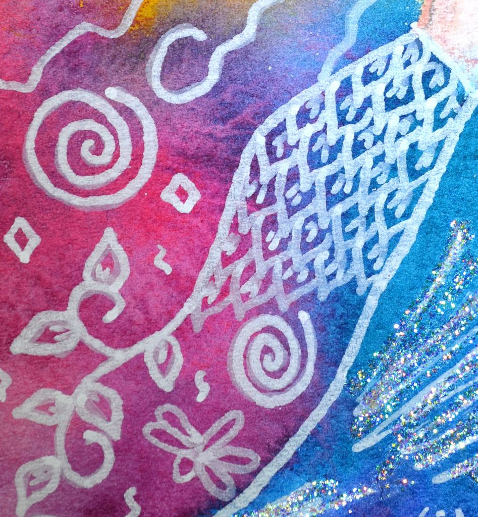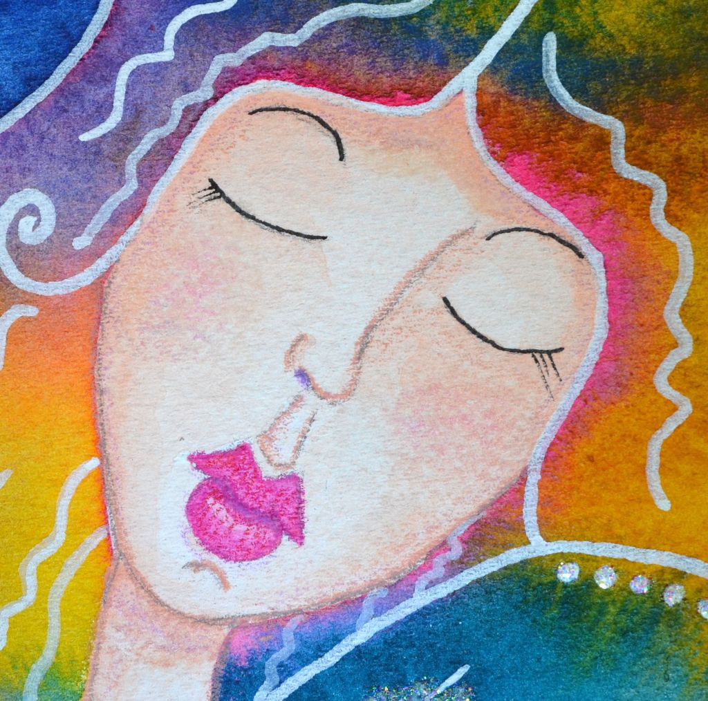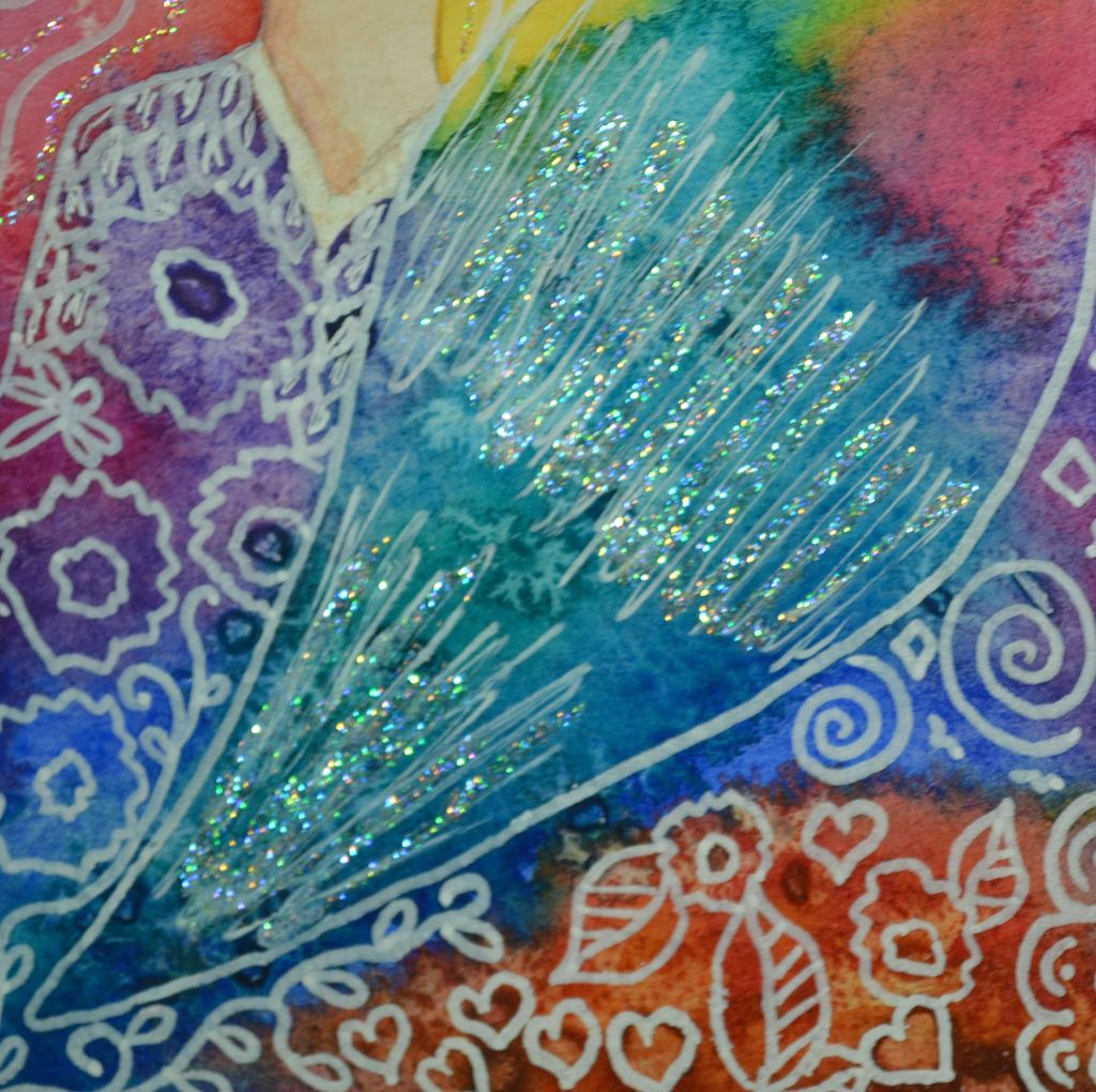 My newest angel I created in my Strathmore 5.5″ x 8.5″ Watercolor Journal called Breathe. One of the fun things about watercolor paints is that they sometimes have a mind of their own. I love how colors mingled at the top of her wing.